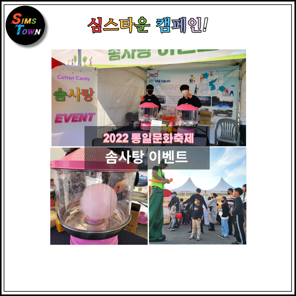 심스타운 또한 솜사탕 이벤트와 키다리삐에로 퍼포먼스로 축제 현장을 풍성하게 만드는데 한몫 했답니다 :)