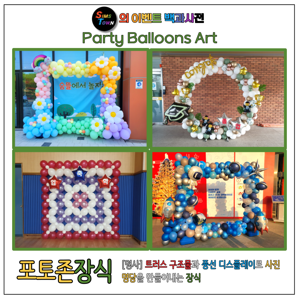 어린이날, 크리스마스 결혼식, 졸업식, 할로윈, 입학식 등의 특정 기념일에 어울리는 포토존장식의 경우, 풍선장식만으로도 기념일의 분위기를 끌어올릴 수 있답니다.