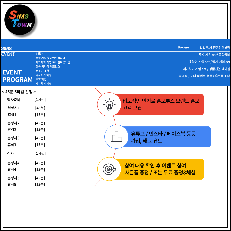 | 전통놀이이벤트 | 민족 고유의 놀이들을 즐길 수 있는 체험 이벤트입니다. | 심스이벤트 |