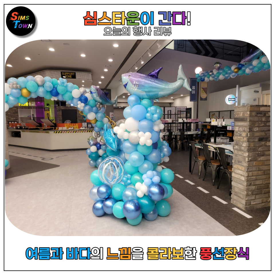 | 기업풍선장식 | 여름하면 떠오르는 바다를 메인 콘셉트로 한 풍선아치, 풍선기둥, 와이어풍선을 설치했습니다. 또한 라운지의 어떤 장소에서 촬영을 해도 멋진 포토존이 될 수 있도록 고안한 풍선장식입니다. | 심스파티 |