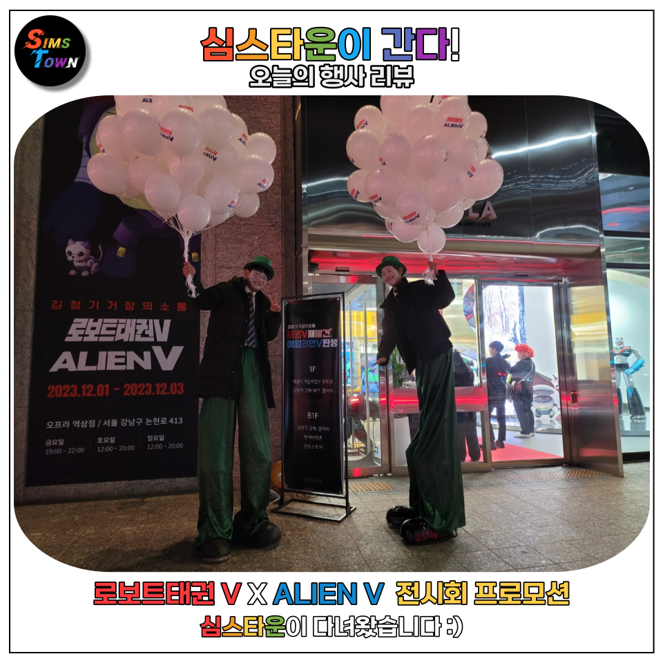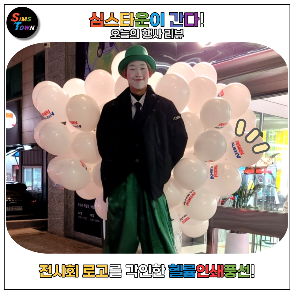 심스타운은 전시회의 오프라인 프로모션을 위해 헬륨인쇄풍선을 든 키다리삐에로 및 팝콘과 솜사탕 이벤트를 준비했는데요.