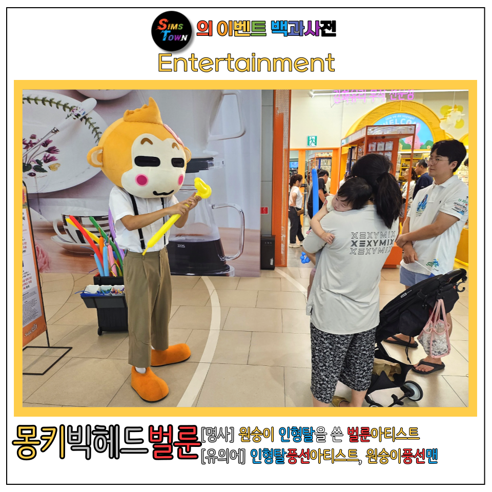 몽키빅헤드피그벌룬 [명사] 원숭이 인형탈을 쓴 벌룬아티스트 [유의어] 인형탈풍선아티스트, 원숭이풍선맨