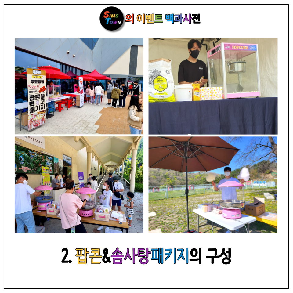 팝콘기계, 솜사탕기계와 함께 심스타운의 친절하고 즐거움을 나누는 스태프, 팝콘이벤트 or 솜사탕이벤트의 진행을 알리는 엑스배너를 함께 주문할 수 있습니다.