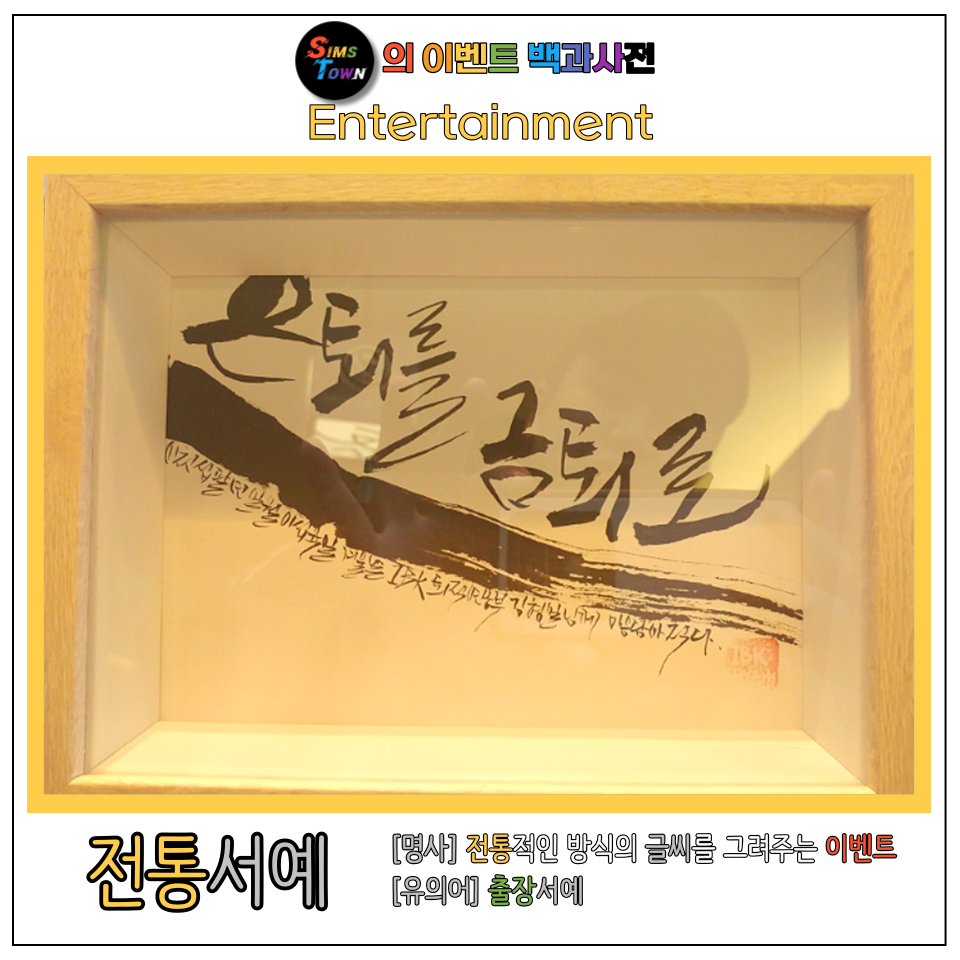 전통서예 [명사] 전통적인 방식의 글씨를 그려주는 이벤트 [유의어] 출장서예