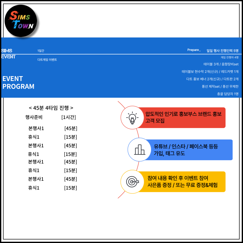 Sims Town 투어 가이드 이번 방문지인 은 심스타운의 진심이 담긴 포트폴리오를 담았습니다. SimsEvent 오픈행사, 룰렛&에어볼, 홍보차량, 팝콘&솜사탕, 커팅식 등 이벤트 프로모션 SimsEnter 공연, 레크