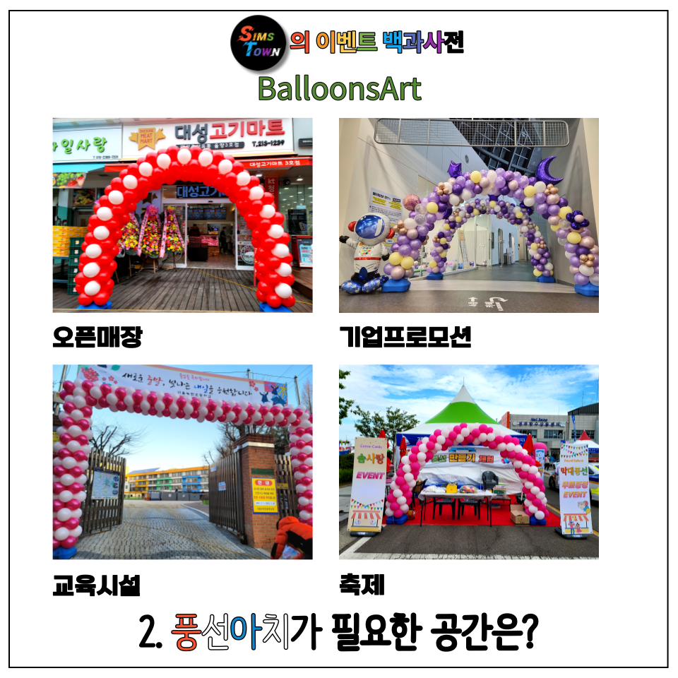 | 오픈행사 매장 or 리뉴얼 오픈매장 | 매장 입구에만 디스플레이하면 되기에 풍선아치 단품의 활용도가 가장 높음. 개업 또는 리뉴얼을 쉽고 간단하게 알릴 수 있음. 잠재적 고객(행인)들의 시선을 끌 수 있음. |