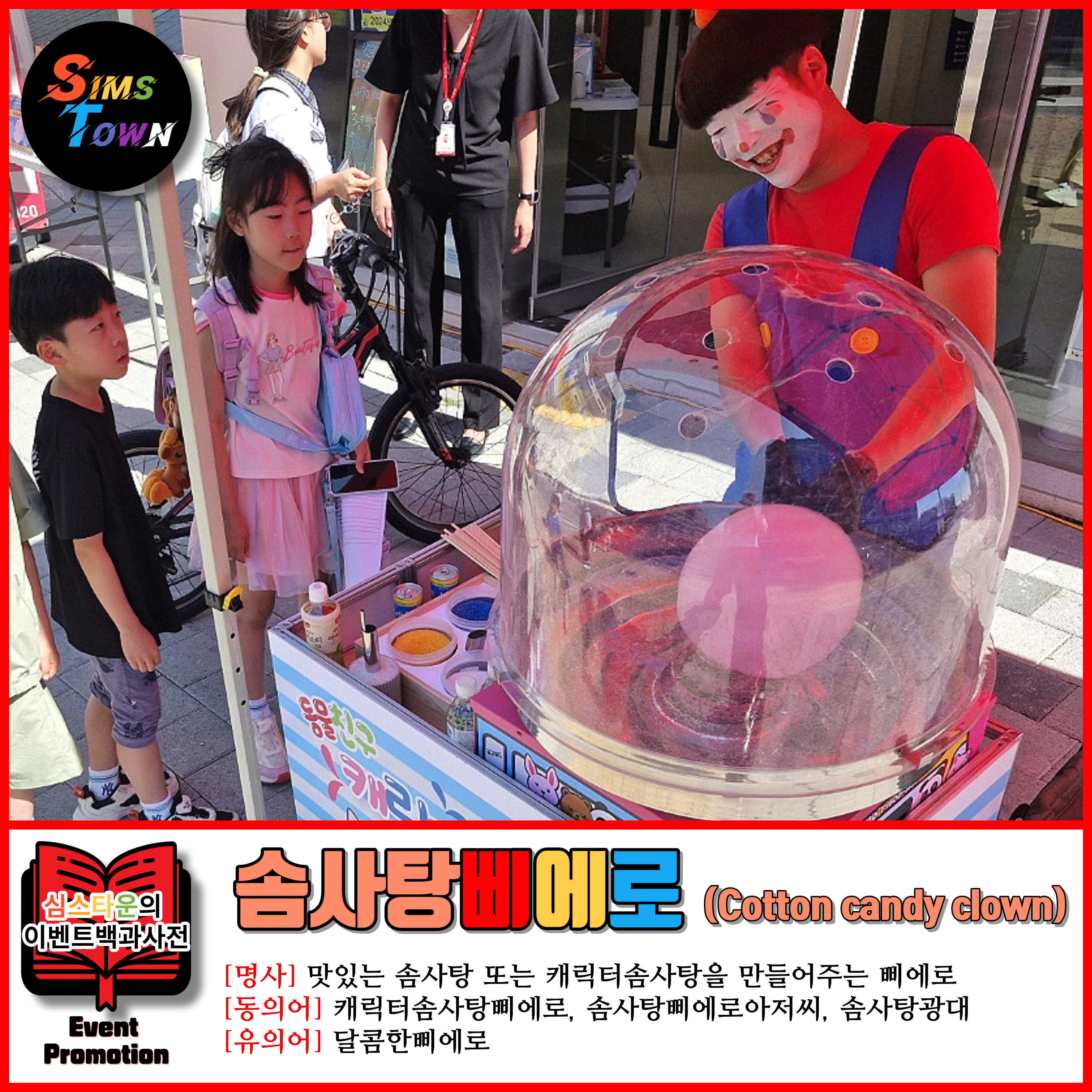 [명사] 맛있는 솜사탕 또는 캐릭터솜사탕을 만들어주는 삐에로