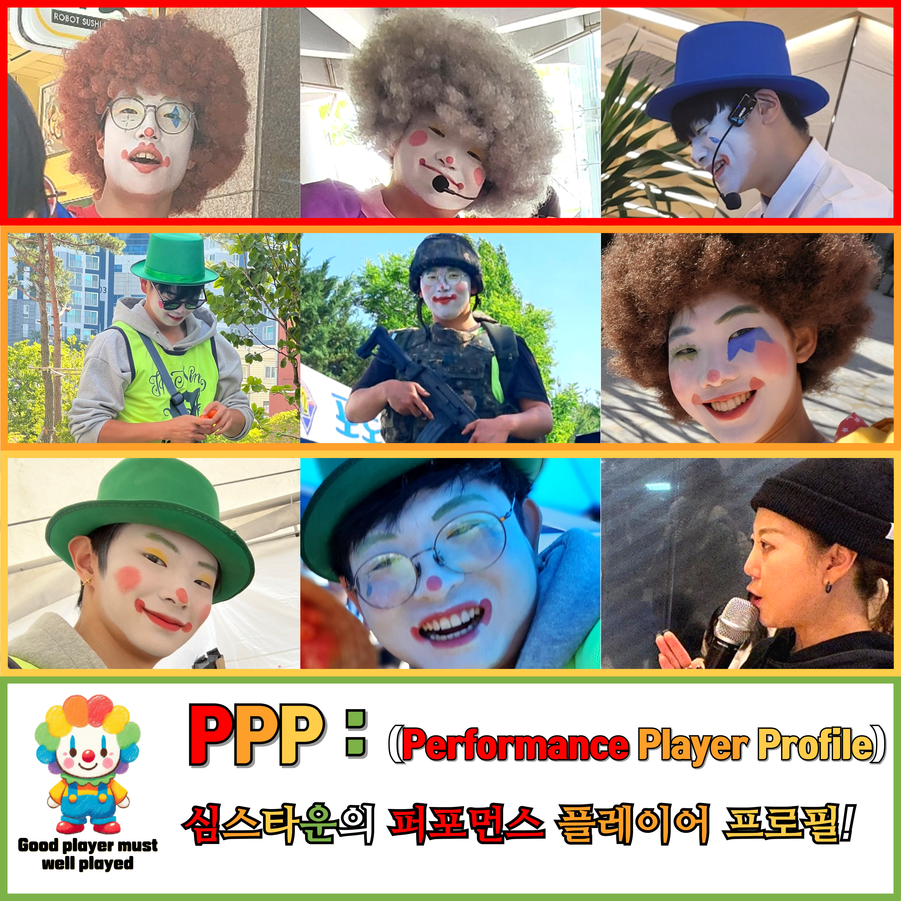 퍼포먼스에서는 석고상을 연기하고 있고, 한복삐에로에서는 동서양의 매력을 집합시킨 퍼포머가 되었으며, 사회자에서는 큐카드를 들고 무대에 선 모습을, 벌룬쇼에서는 시선을 집중시키는 공연자가 되었습니다.