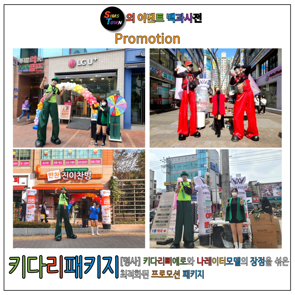 | 키다리삐에로 | 높은 키에서 나오는 시인성과 가시성. 풍선아트 퍼포먼스 및 프로모션 전단지 배포. |
