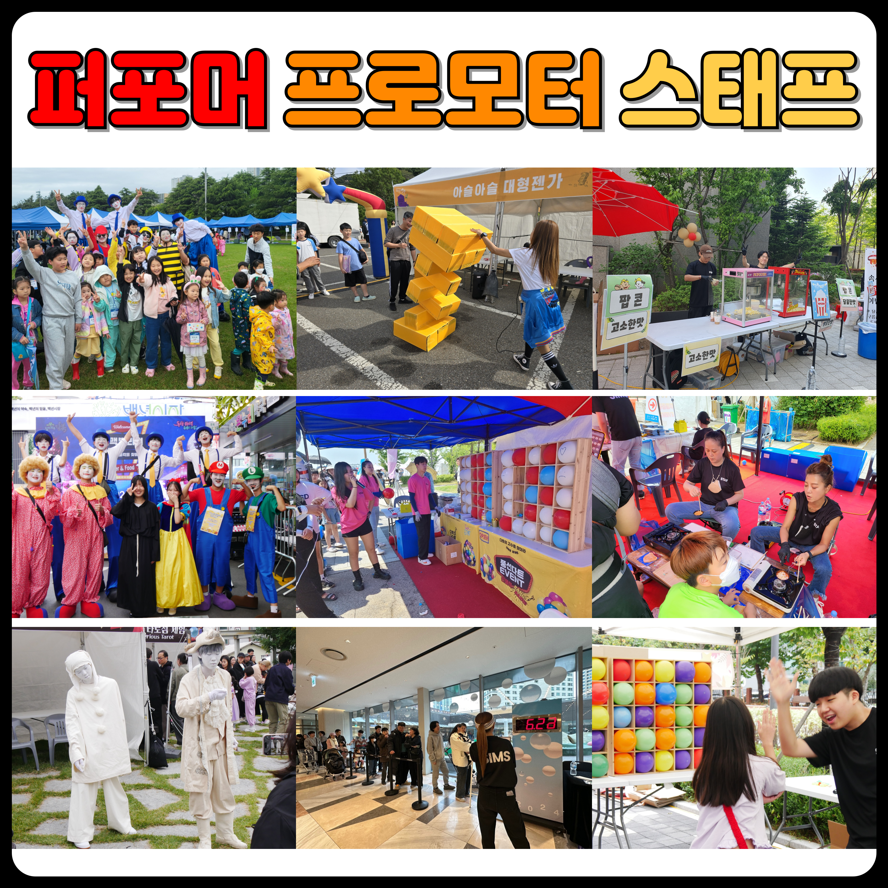 고객이 직접 체험할 수 있는 풍선다트와 양궁체험, 에어바운스 등의 부스 운영을 맡을 수도 있고, 팝콘이나 솜사탕 및 달고나 등 맛있는 먹거리를 제공할 수도 있습니다.