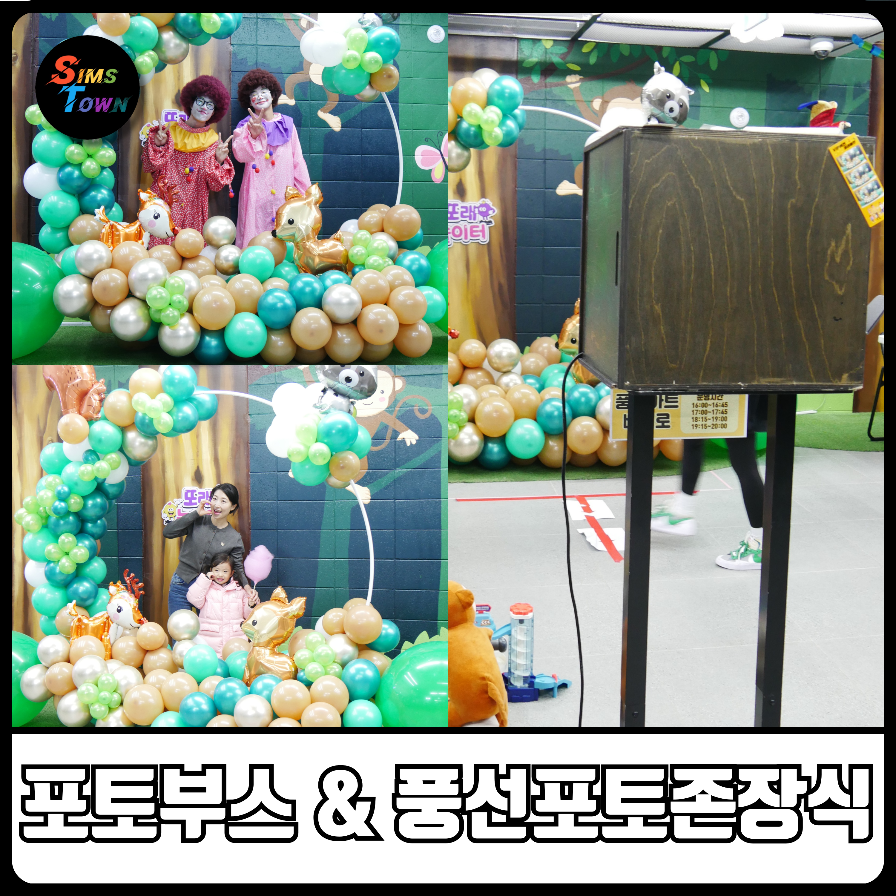 결혼식이나 기업행사에서 주로 볼 수 있는 즉석인화 포토부스에, 심스타운의 장기인 풍선포토존 원형아치장식을 결합했습니다.