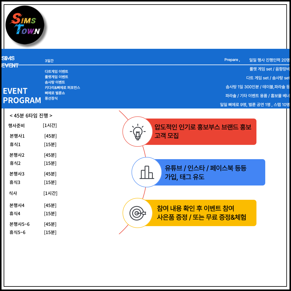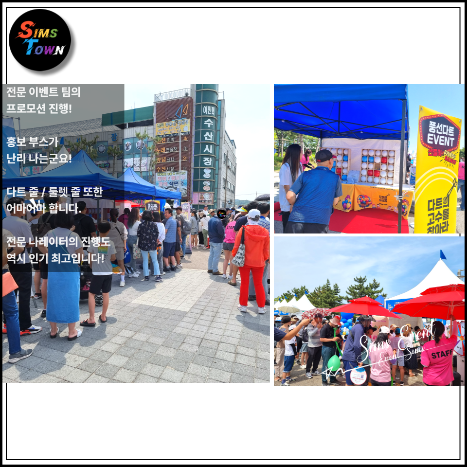 Sims Town 투어 가이드 이번 방문지인 은 심스타운의 진심이 담긴 포트폴리오를 담았습니다. SimsEvent 오픈행사, 룰렛&에어볼, 홍보차량, 팝콘&솜사탕, 커팅식 등 이벤트 프로모션 SimsEnter 공연, 레크