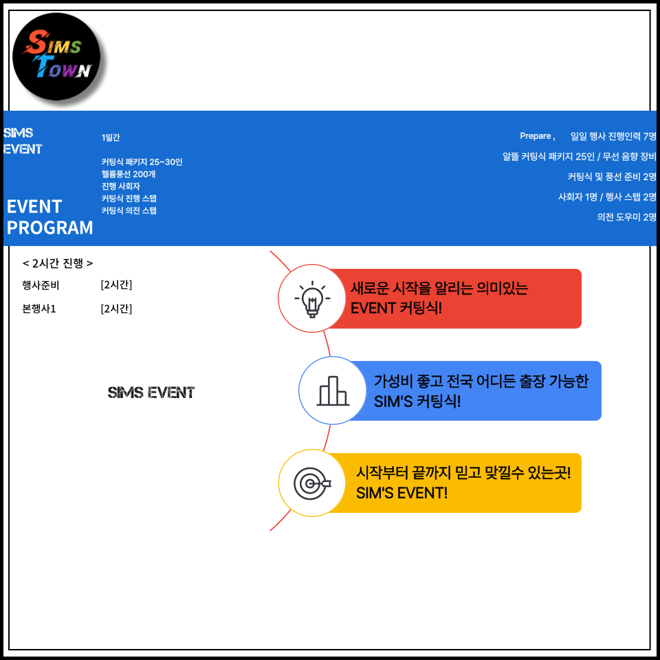 1) 심스이벤트 - 커팅식 패키지, 의전나레이터모델, 헬륨풍선, 진행 스태프