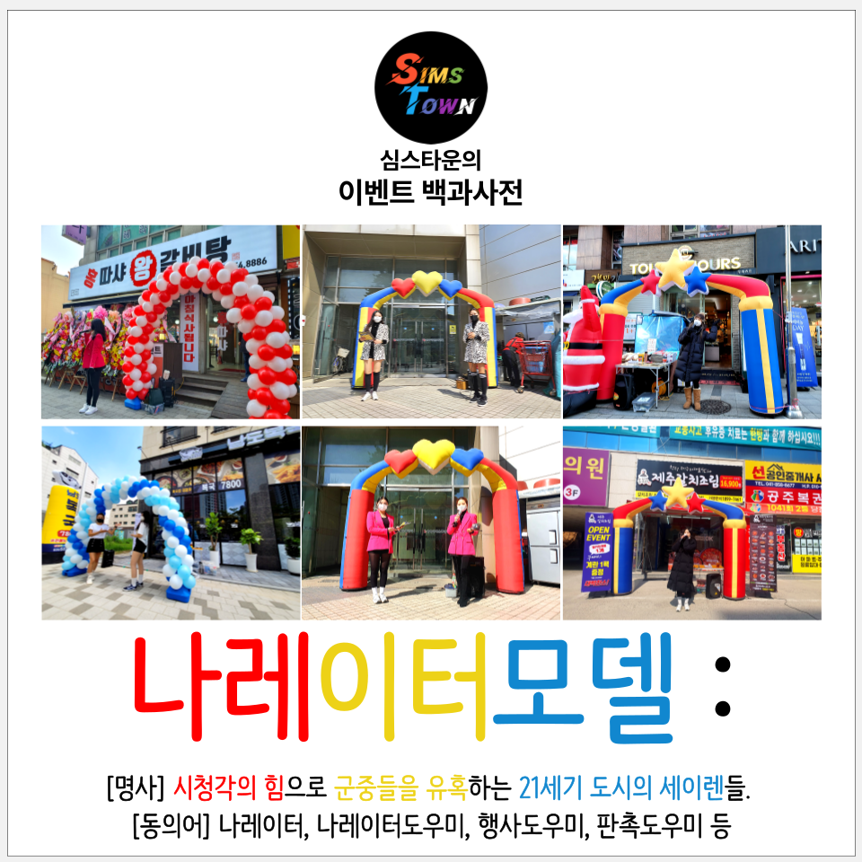 심스타운의 나레이터모델은 현장에 직접 모습을 드러내고 목소리를 뽐내기 때문에, ‘내레이터’와는 기원이 다르다고 볼 수 있겠네요 :)
