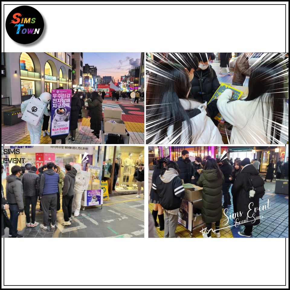 클라이언트인 베이프레소에서 특수 제작한! 우주인 복장을 입은 심스엔터의 퍼포먼스 플레이어들이 번화가를 후끈 달아오르게 했답니다.