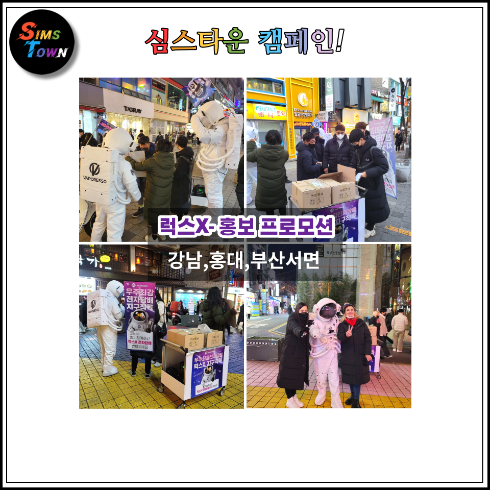 좌우지간, 베이포레소에서 신규 출시한 전자담배 럭스X의 홍보를 위해 심스타운이 강남, 홍대, 부산서면 등의 번화가에 다녀왔습니다.