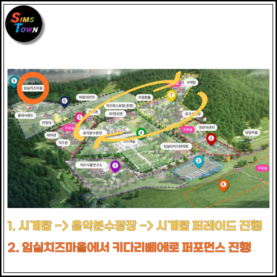 보시는 것처럼 퍼레이드팀은 임실치즈테마파크의 가장 높은 곳인 시계탑 광장에서부터 퍼레이드를 시작해, 음악분수광장에서 공연을 진행한 후 시계탑으로 돌아가는 동선으로 행사를 진행했는데요.