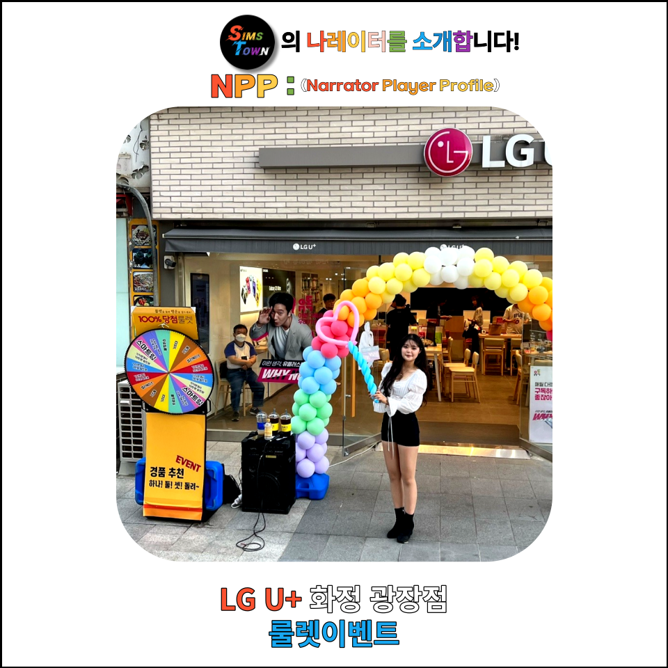 매장 입구에 형형색색 풍선아치와 룰렛판이 설치된 LG U+ 화정 광장점에서 룰렛을 돌리면 경품을 나눠드리는 행사를 진행했습니다!