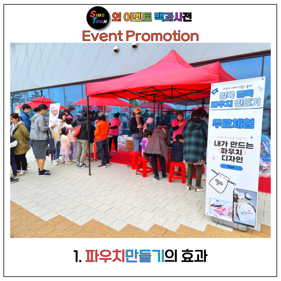 클라이언트의 행사장을 찾아온 체험자들이 자녀 또는 친지, 연인과 즐거운 시간을 갖고, 소셜미디어에 후기를 올려 브랜드 파워를 상승시키는 것으로 파우치 만들기의 효과는 빛을 볼 수 있겠죠.