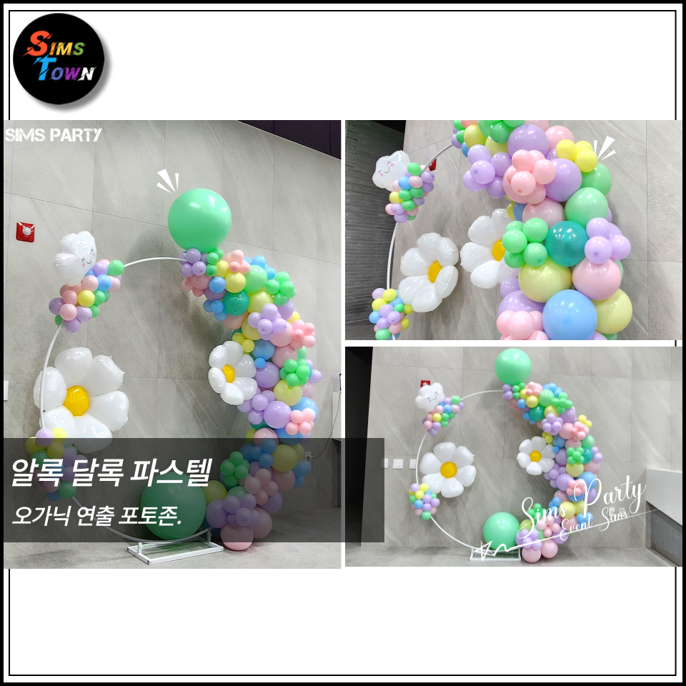 | 관공서풍선장식 | 여러가지의 색상과 고유한 스타일을 조화롭게 이룬 오가닉 풍선장식입니다. 포토존장식과 기둥풍선, 벽에 부착하는 꽃풍선장식이 포함된 구성입니다. | 심스파티 |