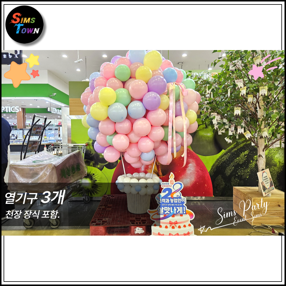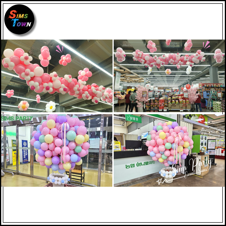 | 기업풍선장식 | 열기구 모양을 형상화한 마카롱 컬러의 오가닉 풍선장식입니다. 천정에는 와이어풍선장식을 설치하여 환상적인 분위기를 연출했습니다. 포토존장식으로서의 구성 또한 갖췄습니다. | 심스파티 |